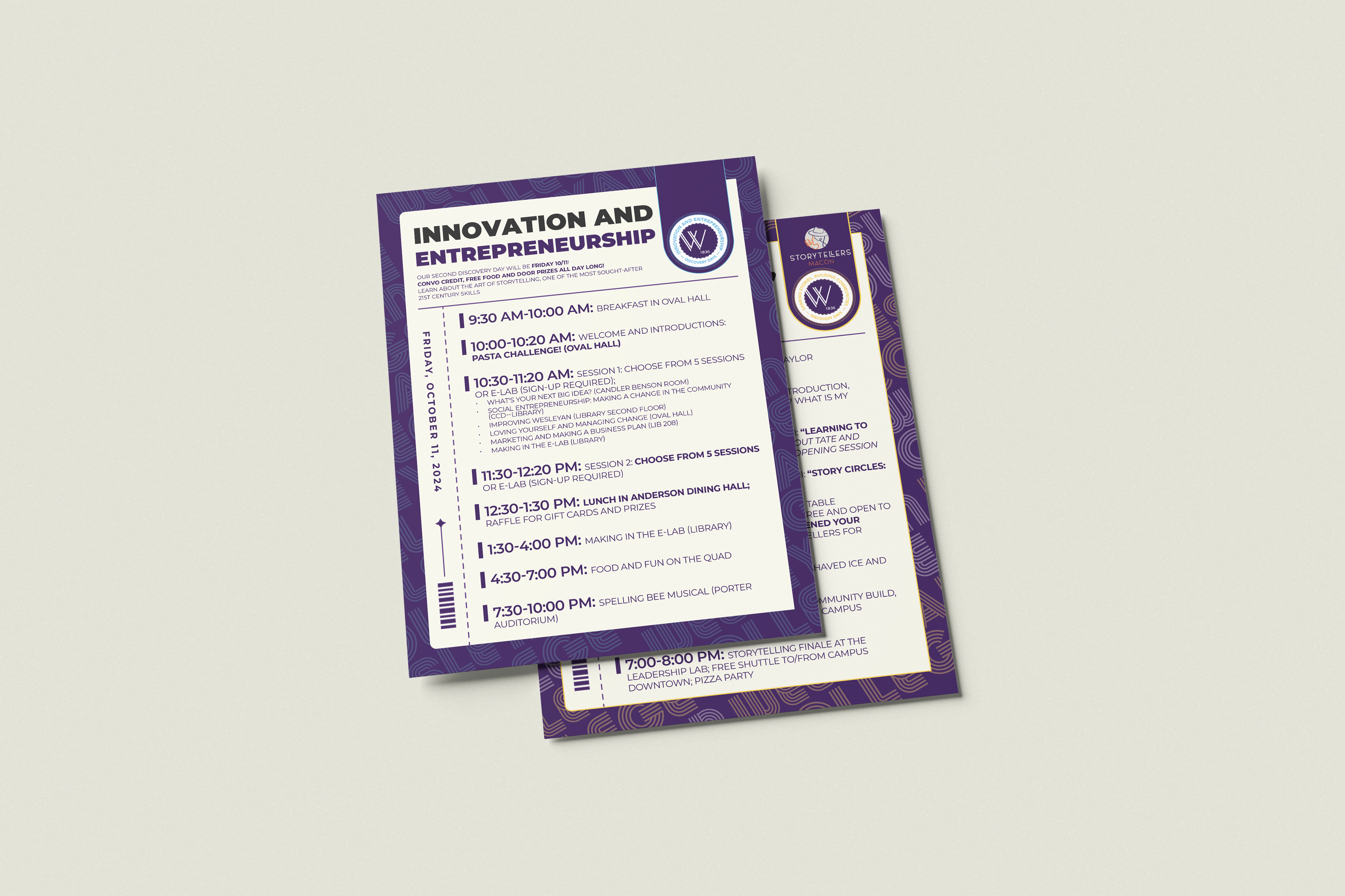 Each badge used simple iconography and bright colors to differentiate the themes. I integrated them into flyers with a clear hierarchy: date, theme, and call-to-action. The designs were optimized for both print and digital campus promotion.